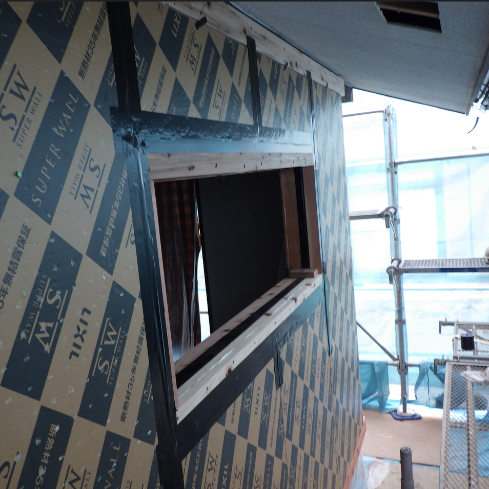 外壁下地工事が終わり、窓部分の気密工事を行います。